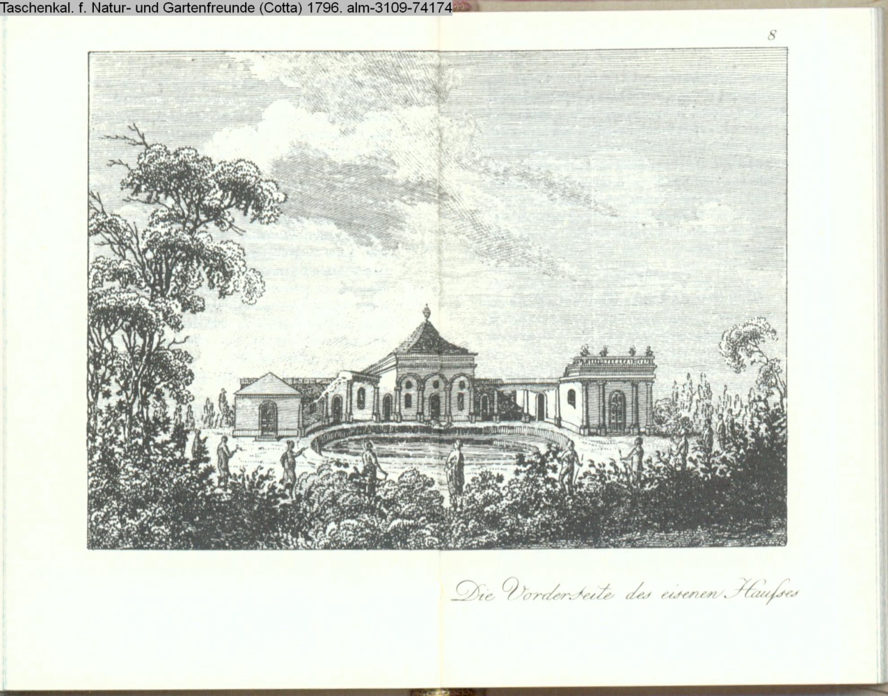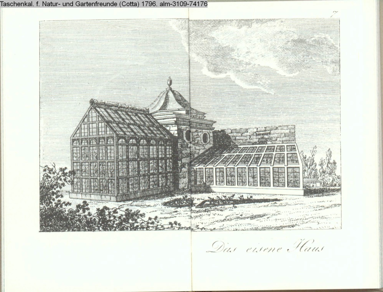 Illustration zu »Beschreibung des Gartens in Hohenheim. Fortsetzung. / Das eisene Haus. / Von der RükSeite« von G. H. Rapp INr 74175, Obj 25