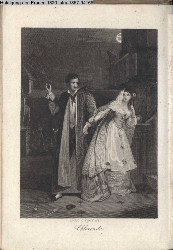 Bilderchronik der theatralischen Zeiterscheinungen, für 1834 (Sammlung INr 77438, Obj 6) Illustration zu »Das Liebes-Protokoll« von J. L. F. Deinhardstein s. Textbezug INr 77443, Obj 11