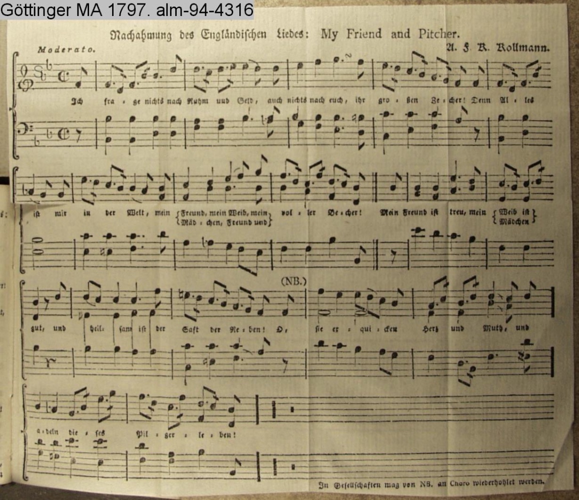 Vertonung des Gedichts »Nachahmung des Engländischen Liedes: My Friend and Pitcher« durch den Verfasser