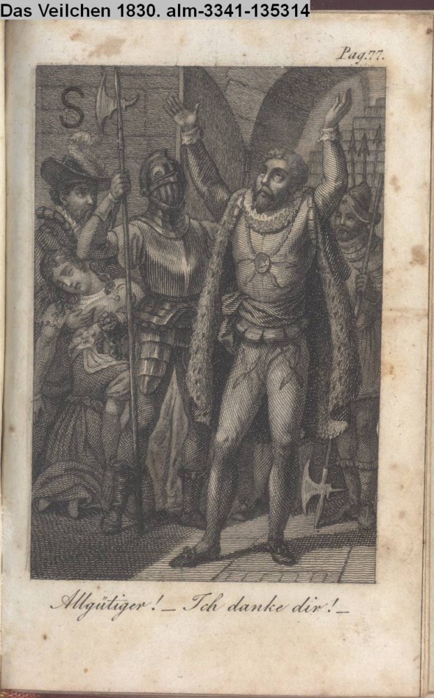 Graphik im Kalendarium Mai; an der Graphik Pag. 77; Illustration zu »Fünfter Aufzug des Allessandro Manzonischen Trauerspieles: Craf Carmagnola. Metrisch von J. G. Seidl« INr 135340, Obj 30