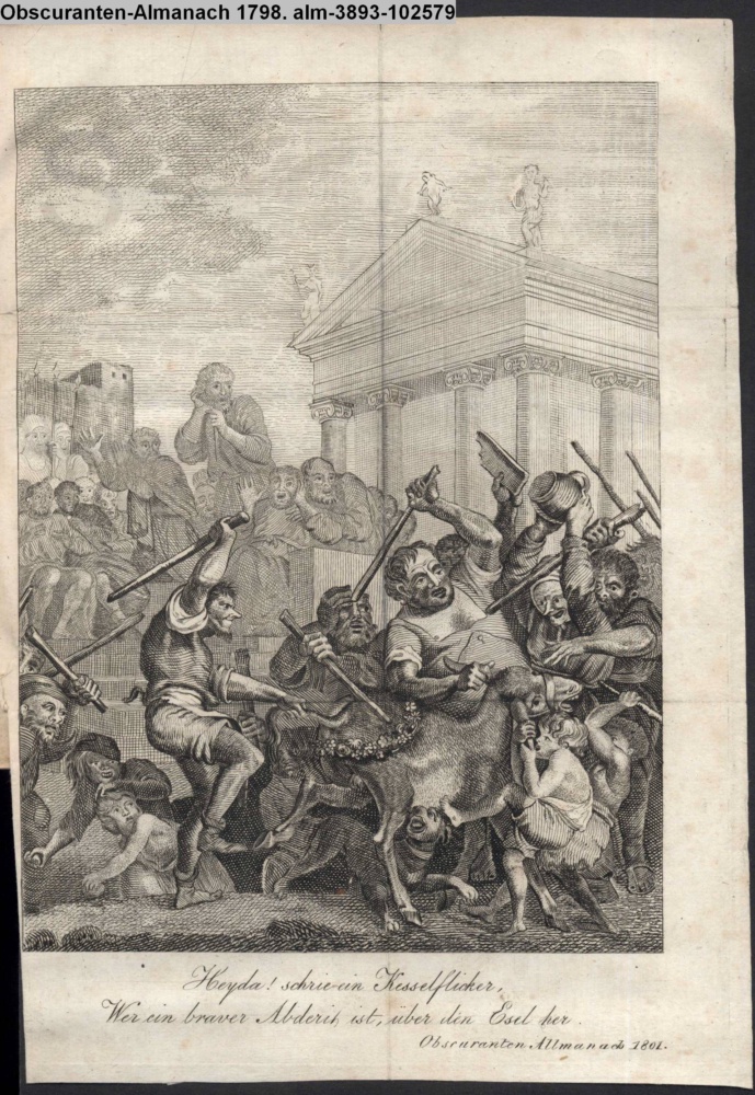 Heyda! schrie ein Kesselflicker, / Wer ein braver Abderit ist, über den Esel her. / Obscuranten Allmanach 1801