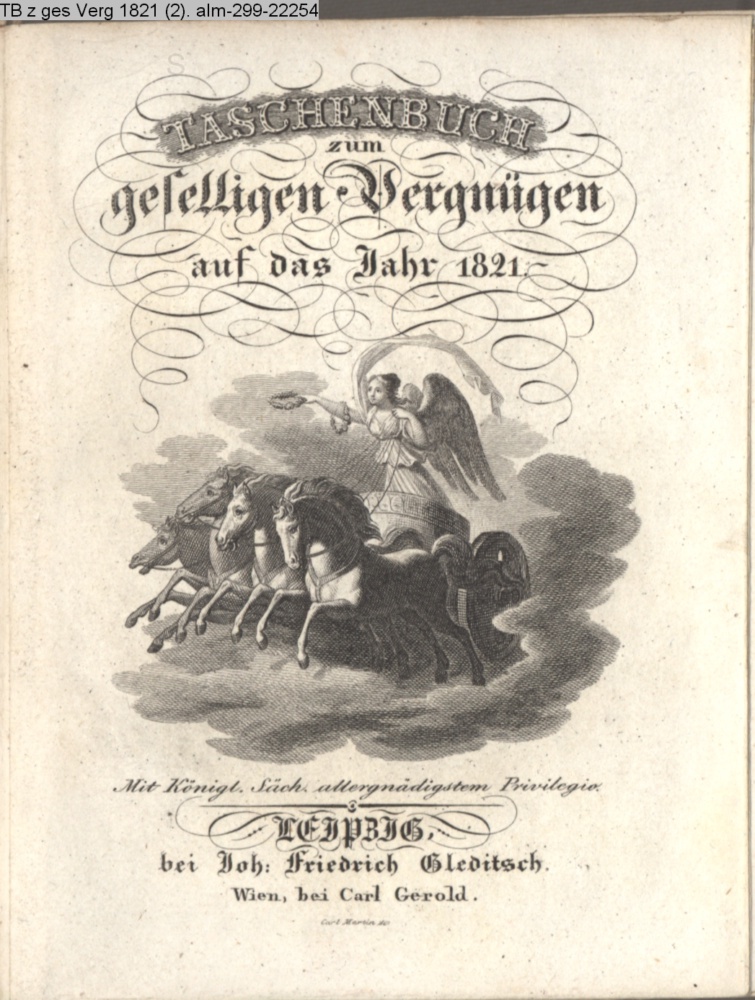 TASCHENBUCH / zum / geselligen Vergnügen / auf das Jahr 1821. / Mit Königl. Sächs. allergnädigsten Privilegio. / LEIPZIG, / bei Joh. Friedrich Gleditsch. / Wien, bei Carl Gerold