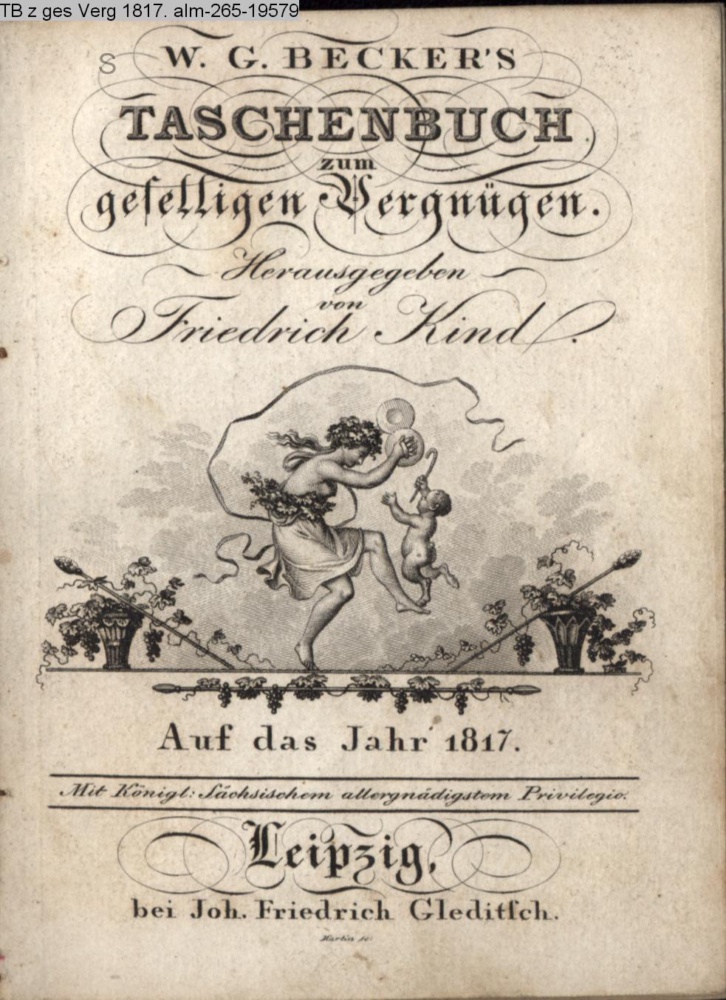 W. G. BECKER'S / TASCHENBUCH / zum / geselligen Vergnügen. / Herausgegeben / von / Friedrich Kind / Auf das Jahr 1817. / Mit Königl. Sächsischem allergnädigstem Privilegio. / Leipzig, / bei Joh. Friedrich Gleditsch