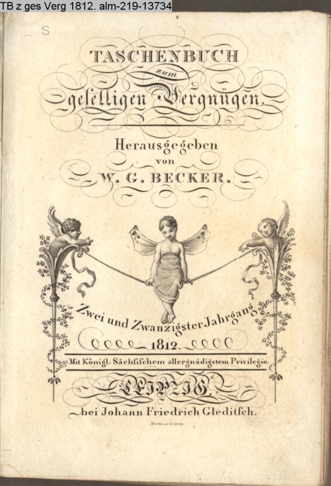 TASCHENBUCH / zum / geselligen Vergnügen. / Herausgegeben / von / W. G. BECKER. / Zwei und Zwanzigster Jahrgang / 1812. / Mit Königl. Sächsischem allergnädigstem Privilegio. / LEIPZIG, / bei Johann Friedrich Gleditsch