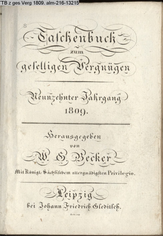 Taschenbuch / zum / geselligen Vergnügen / Neunzehnter Jahrgang / 1809. / Herausgegeben / von / W. G. Becker / Mit Königl. Sächsischem allergnädigsten Privilegio. / Leipzig / bei Johann Friedrich Gleditsch