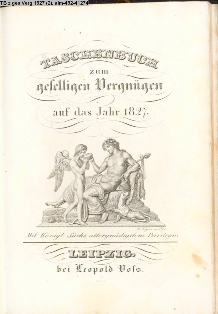 TASCHENBUCH / zum / geselligen Vergnügen / auf das Jahr 1827. / Mit Königl. Sächs. allergnädigstem Privilegio. / LEIPZIG, / bei Leopold Voss
