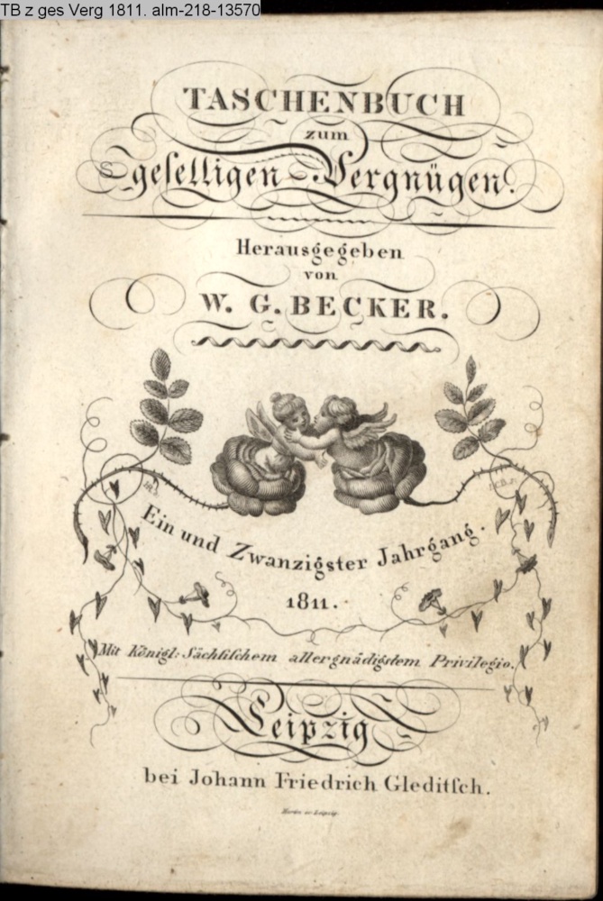 TASCHENBUCH / zum / geselligen Vergnügen / Herausgegeben / von / W. G. BECKER / Ein und Zwanzigster Jahrgang / 1811. / Mit Königl. Sächsischem allergnädigstem Privilegio. / Leipzig / bei Johann Friedrich Gleditsch