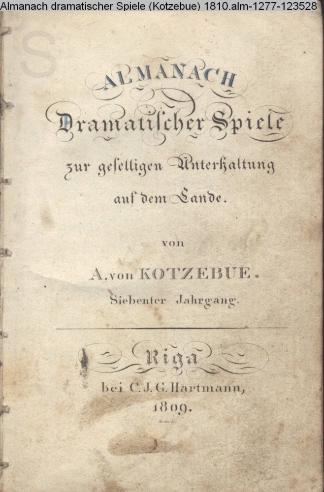 Almanach / Dramatischer Spiele / zur geselligen Unterhaltung / auf dem Lande / von / A. von Kotzebue. / Siebenter Jahrgang / Riga / bei C. J. G. Hartmann, / 1809. / Martin sc.