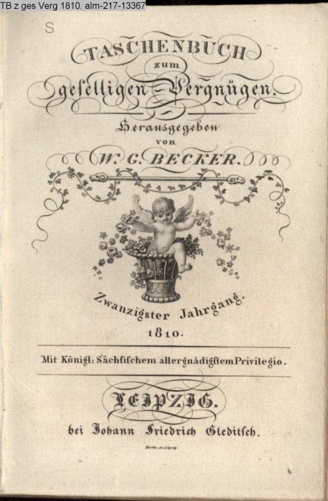 TASCHENBUCH / zum / geselligen Vergnügen. / Herausgegeben / von W. G. Becker / Zwanzigster Jahrgang. / 1810. / Mit Königl. Sächsischem allergnädigstem Privilegio. / LEIPZIG. / bei Johann Friedrich Gleditsch
