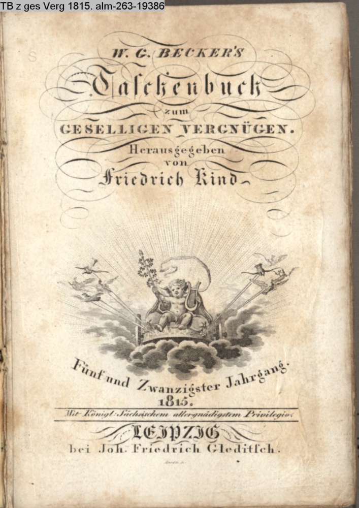 W. G. BECKER'S / TASCHENBUCH / zum / GESELLIGEN VERGNÜGEN. / Herausgegeben / von / Friedrich Kind / Fünf und Zwanzigster Jahrgang. / 1815. / Mit Königl. Sächsischem allergnädigsten Privilegio. / LEIPZIG / bei Joh. Friedrich Gleditsch