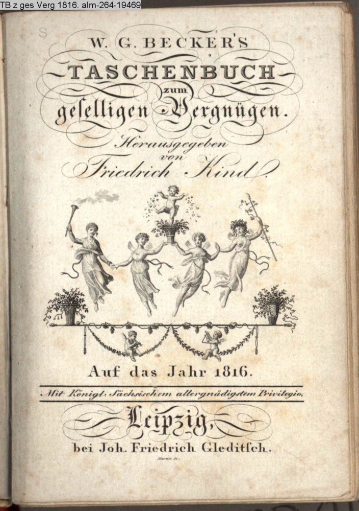 W. G. BECKER'S / TASCHENBUCH / zum / geselligen Vergnügen. / Herausgegeben / von / Friedrich Kind / Auf das Jahr 1816. / Mit Königl. Sächsischem allergnädigstem Privilegio. / LEIPZIG, / bei Joh. Friedrich Gleditsch