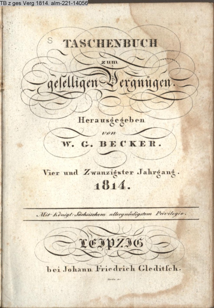 TASCHENBUCH / zum / geselligen Vergnügen. / Herausgegeben / von W. G. BECKER. / Vier und Zwanzigster Jahrgang. / 1814. / Mit Königl: Sächsischem allergnädigstem Privilegio. / LEIPZIG / bei Johann Friedrich Gleditsch
