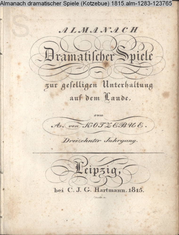 ALMANACH / Dramatischer Spiele / zur geselligen Unterhaltung / auf dem Lande / von / A. von KOTZEBUE. / Dreizehnter Jahrgang / Leipzig. / bei C. J. G. Hartmann 1815. Martin sc.