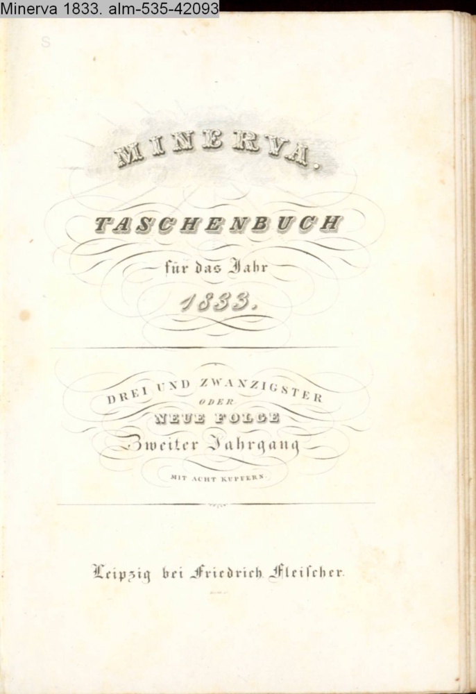 MINERVA. / TASCHENBUCH / für / das Jahr 1833. / DREI UND ZWANZIGSTER / ODER / NEUE FOLGE / Zweiter Jahrgang / MIT ACHT KUPFERN. / Leipzig bei Friedrich Fleischer