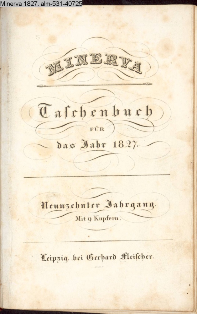MINERVA. / Taschenbuch / Für / das Jahr 1827. / Neunzehnter Jahrgang. / Mit 9 Kupfern. / Leipzig. bei Gerhard Fleischer