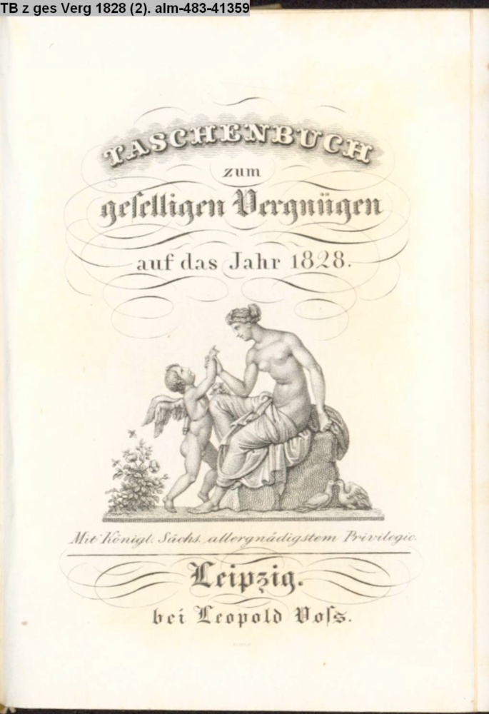 TASCHENBUCH / zum / geselligen Vergnügen / auf das Jahr 1828. / Mit Königl. Sächs. allergnädigstem Privilegio. / Leipzig. / bei Leopold Voss