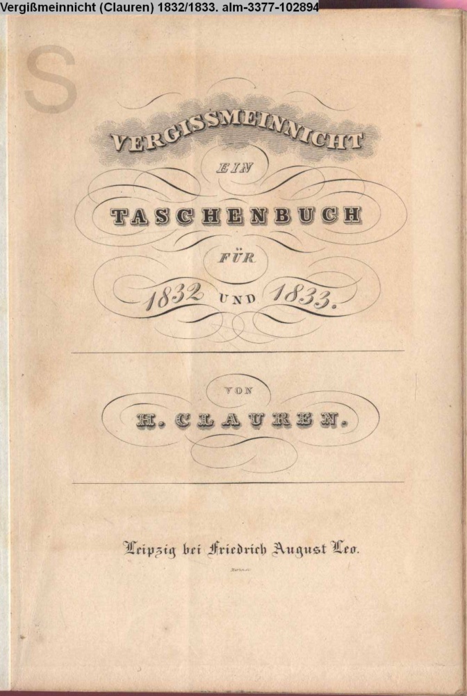 VERGISSMEINNICHT / EIN / TASCHENBUCH / FÜR / 1832 und 1833. / VON / H. CLAUREN. / Leipzig bei Friedrich August Leo