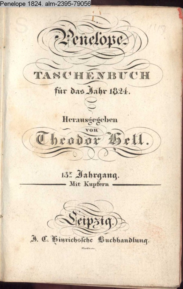 Penelope. / TASCHENBUCH / für das Jahr 1824. / Herausgegeben / von / Theodor Hell. / 13r. Jahrgang. / Mit Kupfern / Leipzig. / J. C. Hinrichssche Buchhandlung