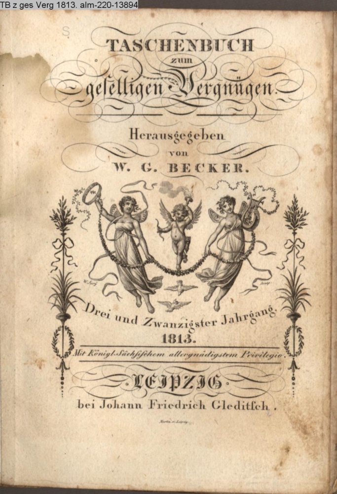 TASCHENBUCH / zum / geselligen Vergnügen. / Herausgegeben / von W. G. BECKER. / Drei und Zwanzigster Jahrgang / 1813. / Mit Königl. Sächsischem allergnädigsten Privilegio. / LEIPZIG. / bei Johann Friedrich Gleditsch