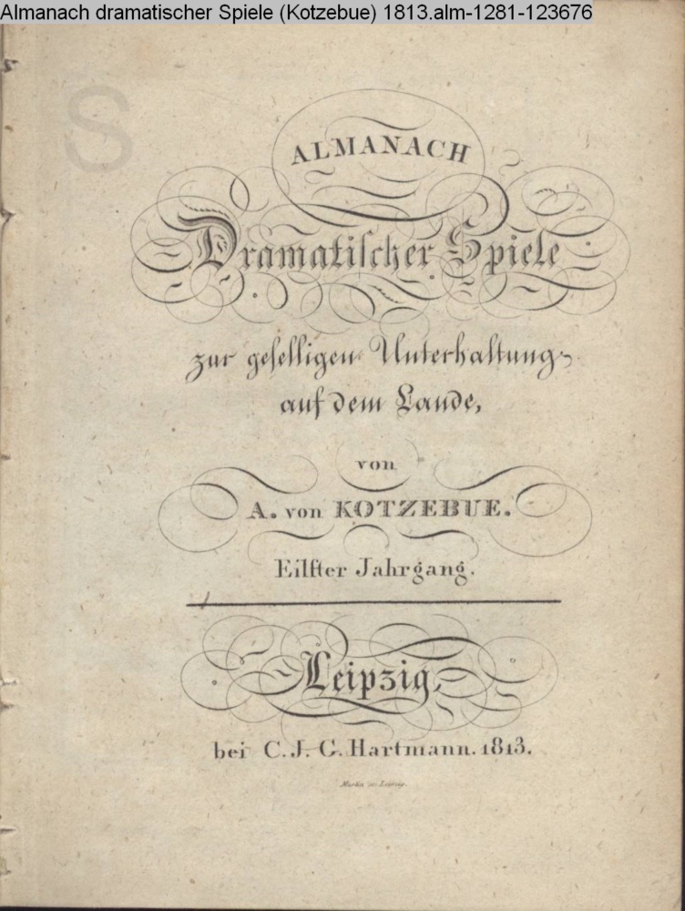ALMANACH / Dramatischer Spiele / zur geselligen Unterhaltung / auf dem Lande / von / A. von KOTZEBUE. / Eilfter Jahrgang / Leipzig / bei C. J. G. Hartmann. 1813 / Martin sc. Leipzig
