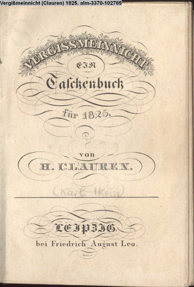 VERGISSMEINNICHT / EIN / Taschenbuch / für / 1825. / von / H. CLAUREN. / LEIPZIG, / bei Friedrich August Leo