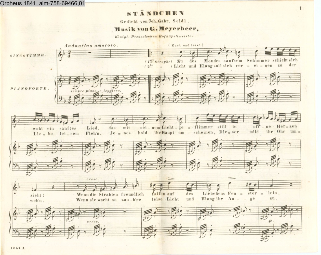 STÄNDCHEN / Gedicht von Joh. Gabr. Seidl. / Musik von G. Meyerbeer, / königl. Preussischem Hofkapellmeister