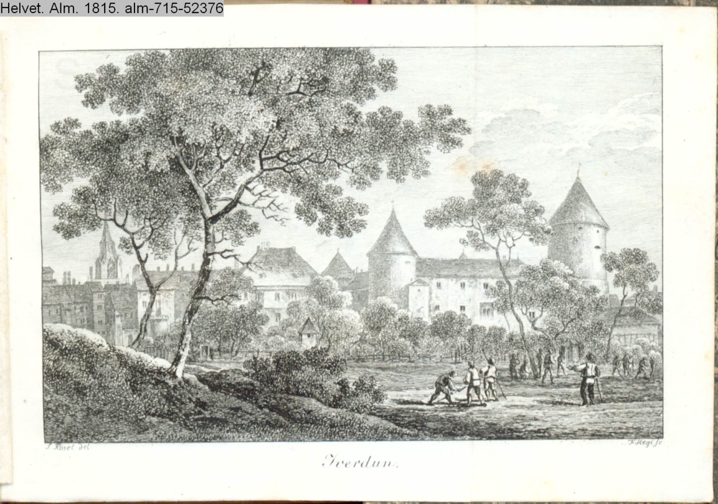 [Ansicht von Wufflens le Château] Illustration zu »Die vier Fräulein von Wüfflens. Nach der ungedruckten, französischen Handschrift der Frau von Montolieu« INr 53032, Obj 60