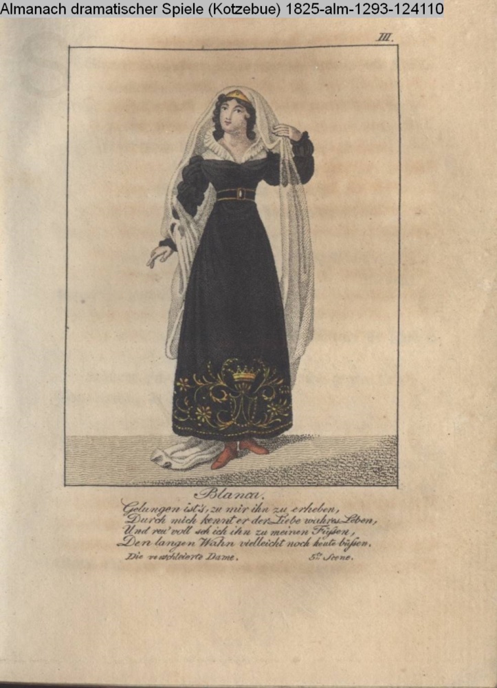 III. / Blanca. / Gelungen ist’s, zu mir ihn zu erheben, / Durch mich kennt er der Liebe wahres Leben, / Und reu’voll seh ich ihn zu meinen Füßen, / Den langen Wahn vielleicht noch heute büßen. / Die verschleierte Dame. 5te Scene.