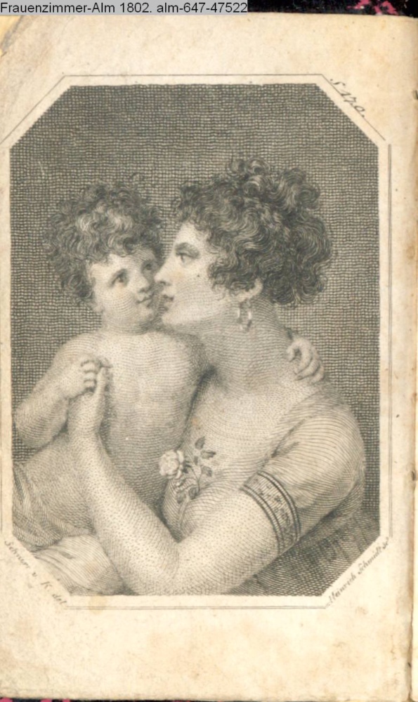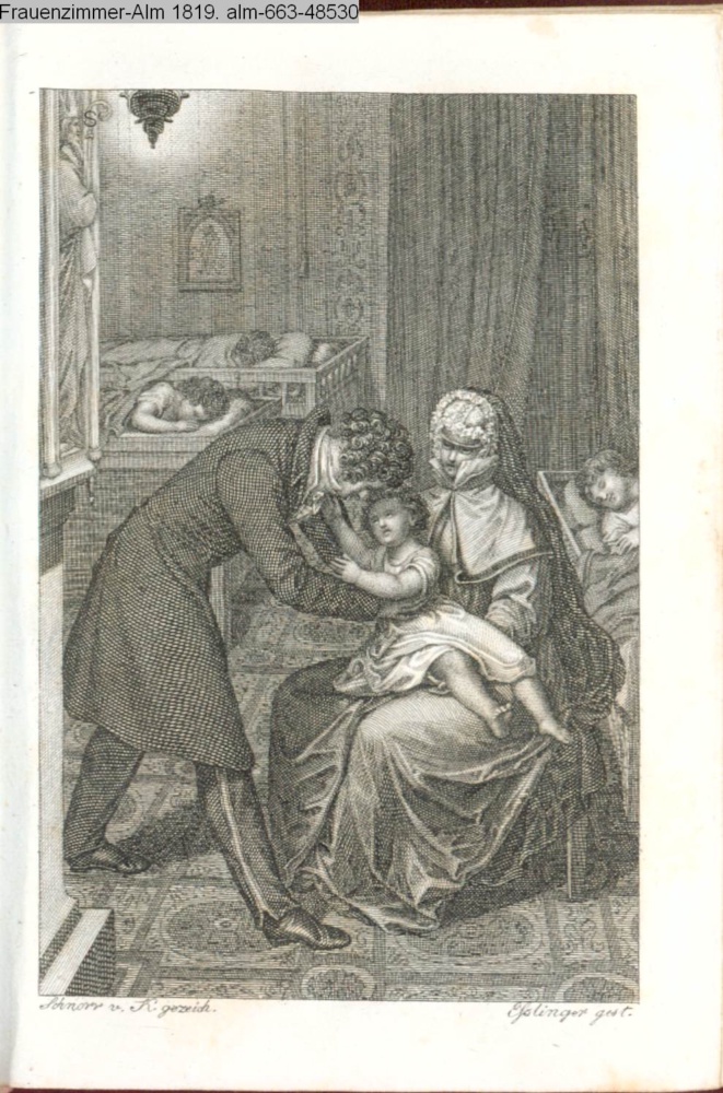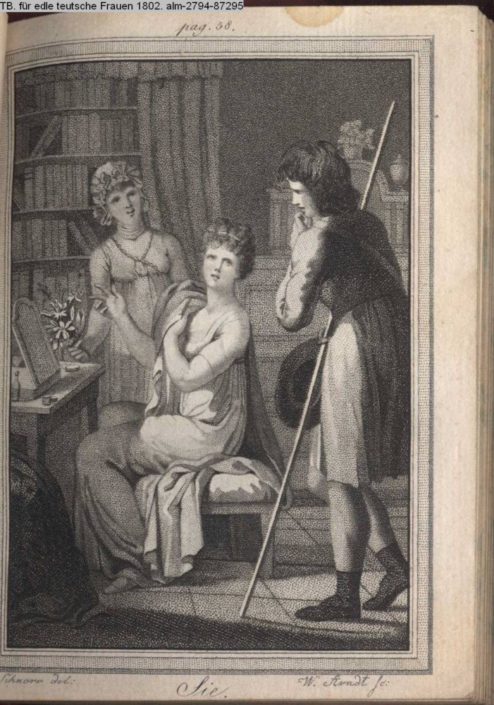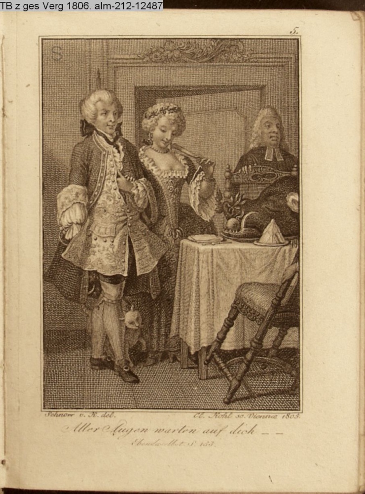 Illustration zu »Alte Zeit und neue Zeit. Ein Fragment aus den nachgelassenen Papieren der verwitweten Frau Ursula Margaretha« von Karl Friedrich Kretschmann in: Taschenbuch zum geselligen Vergnügen 1805 INr 12336