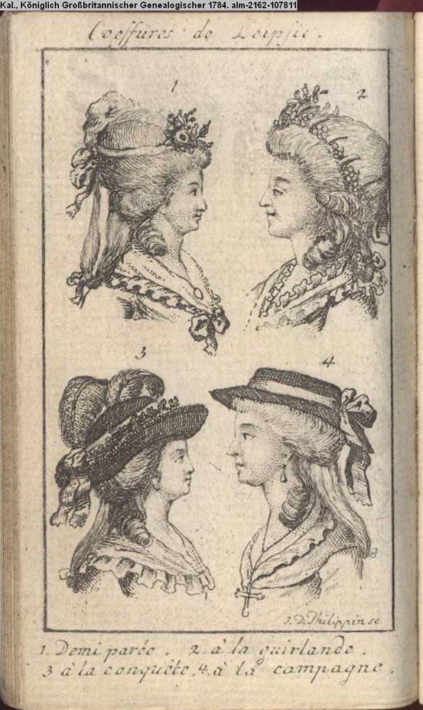 Coeffures de Leipsic. / 1. Demi parée. 2. à la guirlande. / 3 à la conquète. 4. à la campagne
