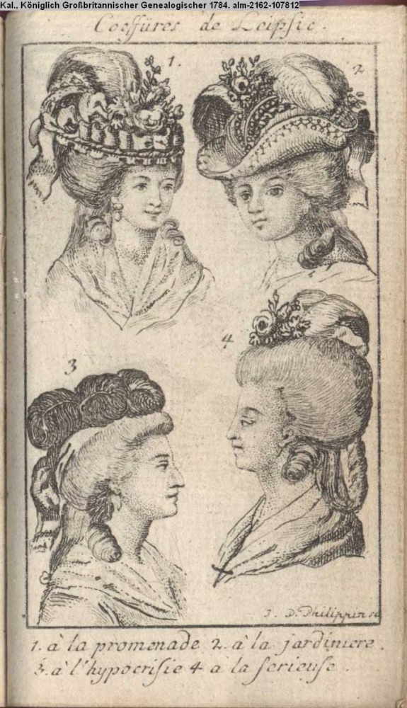 Coeffures de Leipsic. / à la promenade. 2. à la jardiniere. / 3. à la l'hypocrisie 4. à la serieuse