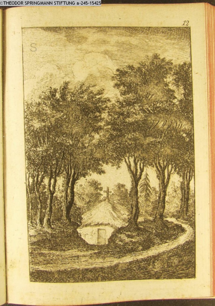 Eine in der Tiefe zwischen Gebüschen ruhende, und von hohen Bäumen überschattete Einsiedeley, #