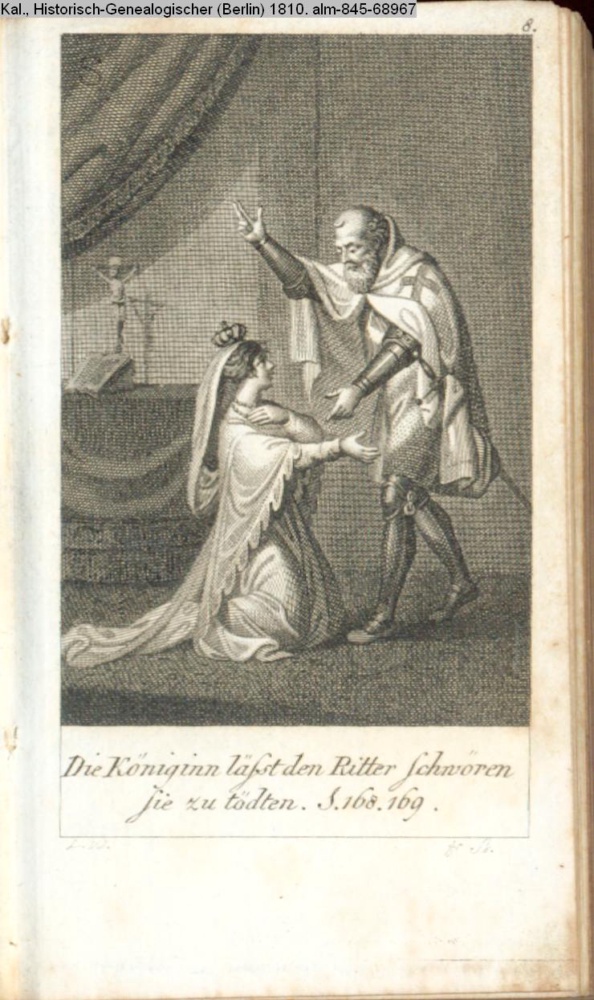 Die Königinn läßt den Ritter schwören / sie zu tödten. S. 168. 169