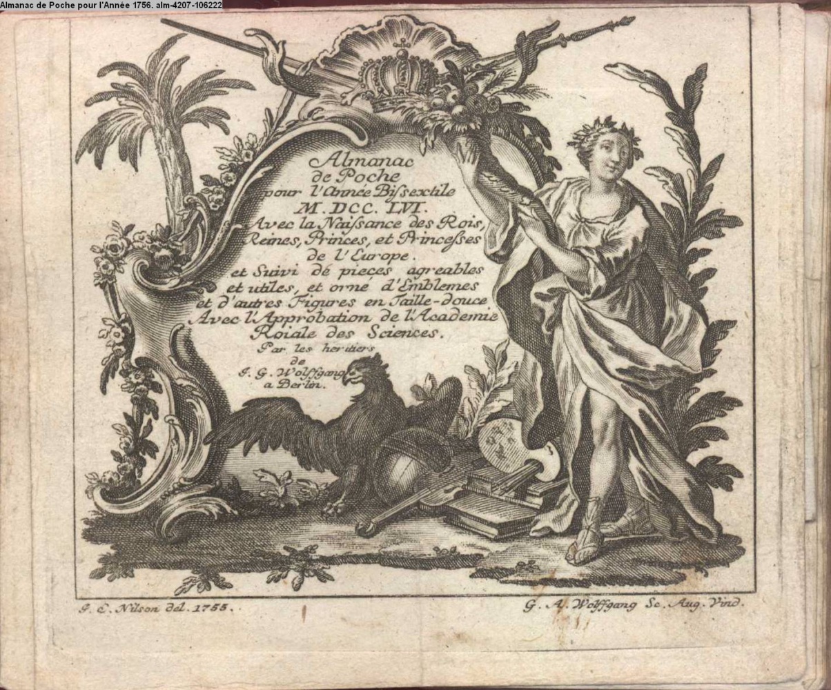 Almanac de Poche pour l’Année 1756 [vielleicht französische Ausgabe von: Schreib- und Postkalender, Genealogischer (Berlin) 1756]