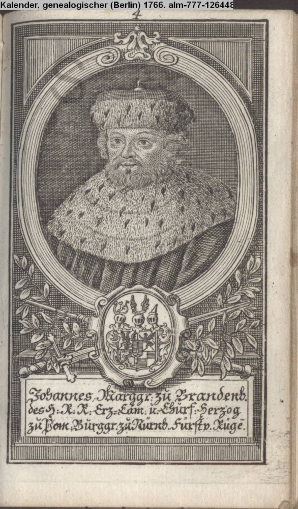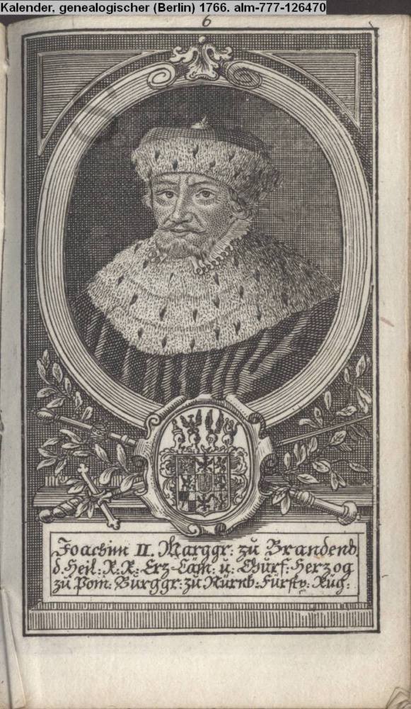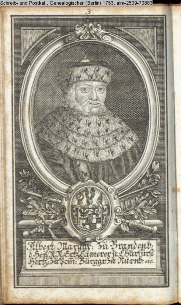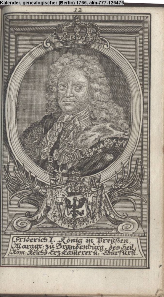 Die durchlauchtigsten Marggrafen Zu Brandenburg aus dem Hohenzollerischen Hause Von Friedrich I. bis auf Sr. jetztregierenden Maj. König Friderichs. In 14 Kupfern vorgestellet von J. G. Wolfgang Königl. Hof-Kupferstecher in Berlin (Sammlung INr 73880, Obj 27) s. Textbezug INr 73908, Obj 55
