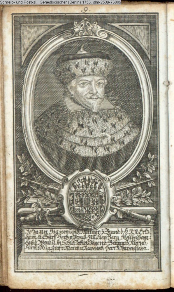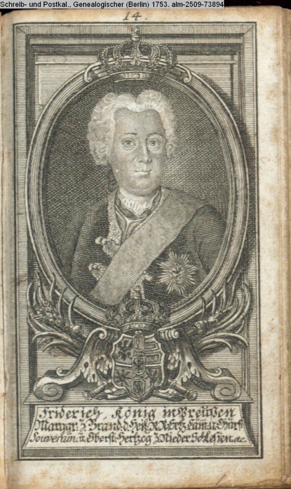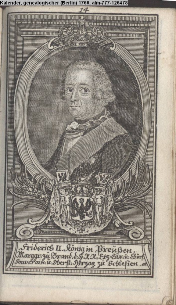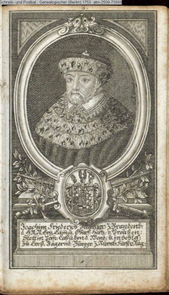 Die durchlauchtigsten Marggrafen Zu Brandenburg aus dem Hohenzollerischen Hause Von Friedrich I. bis auf Sr. jetztregierenden Maj. König Friderichs. In 14 Kupfern vorgestellet von J. G. Wolfgang Königl. Hof-Kupferstecher in Berlin (Sammlung INr 73880, Obj 27) s. Textbezug INr 73899, Obj 46