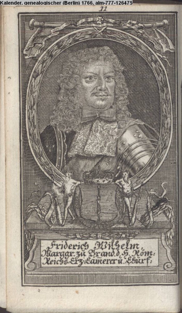 Die durchlauchtigsten Marggrafen Zu Brandenburg aus dem Hohenzollerischen Hause Von Friedrich I. bis auf Sr. jetztregierenden Maj. König Friderichs. In 14 Kupfern vorgestellet von J. G. Wolfgang Königl. Hof-Kupferstecher in Berlin (Sammlung INr 73880, Obj 27) s. Textbezug INr 73904, Obj 51