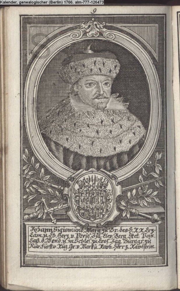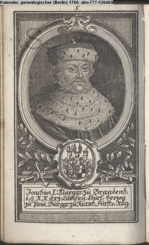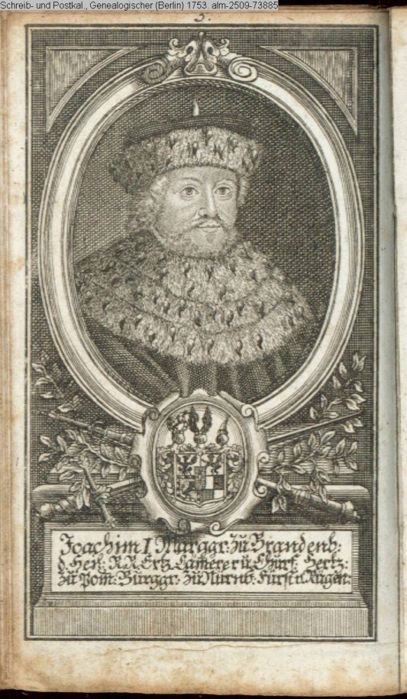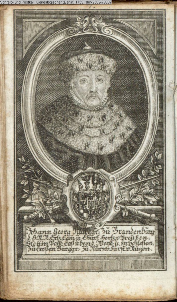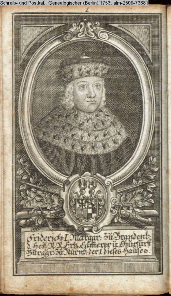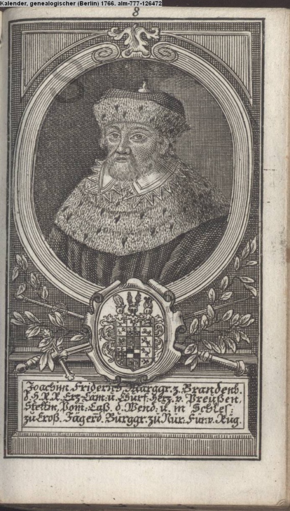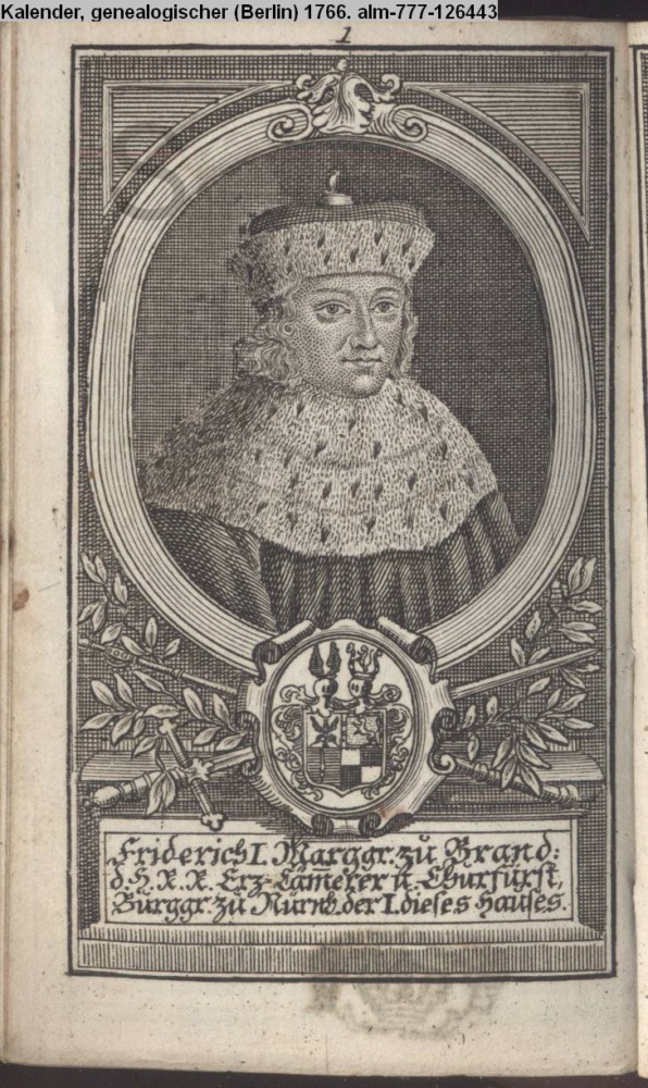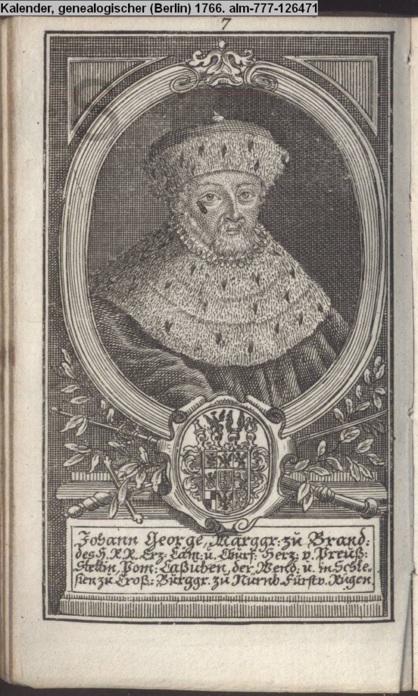 Die durchlauchtigsten Marggrafen Zu Brandenburg aus dem Hohenzollerischen Hause Von Friedrich I. bis auf Sr. jetztregierenden Maj. König Friderichs. In 14 Kupfern vorgestellet von J. G. Wolfgang Königl. Hof-Kupferstecher in Berlin (Sammlung INr 73880, Obj 27)