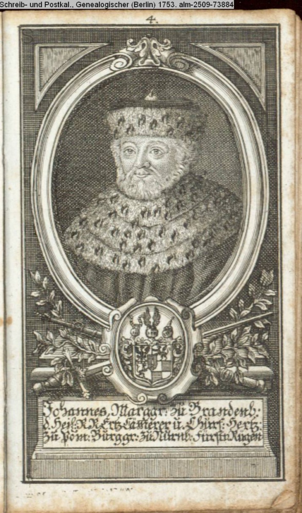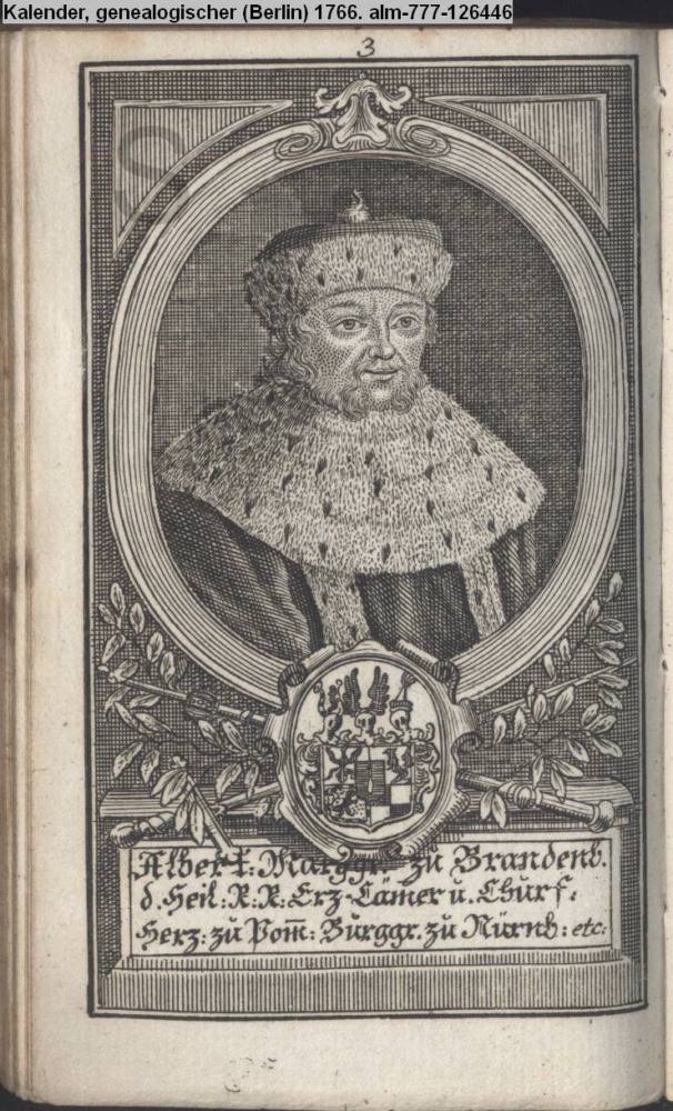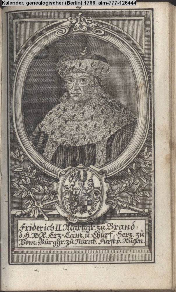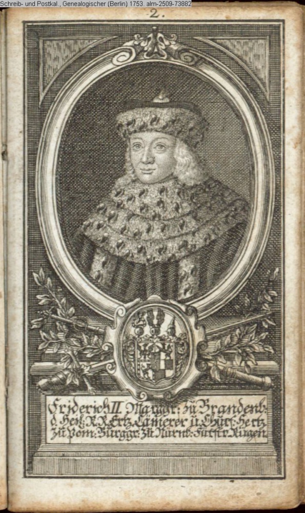 Die durchlauchtigsten Marggrafen Zu Brandenburg aus dem Hohenzollerischen Hause Von Friedrich I. bis auf Sr. jetztregierenden Maj. König Friderichs. In 14 Kupfern vorgestellet von J. G. Wolfgang Königl. Hof-Kupferstecher in Berlin (Sammlung INr 73880, Obj 27) s. Textbezug INr 73902, Obj 49