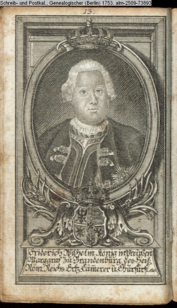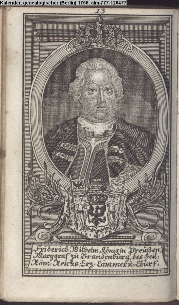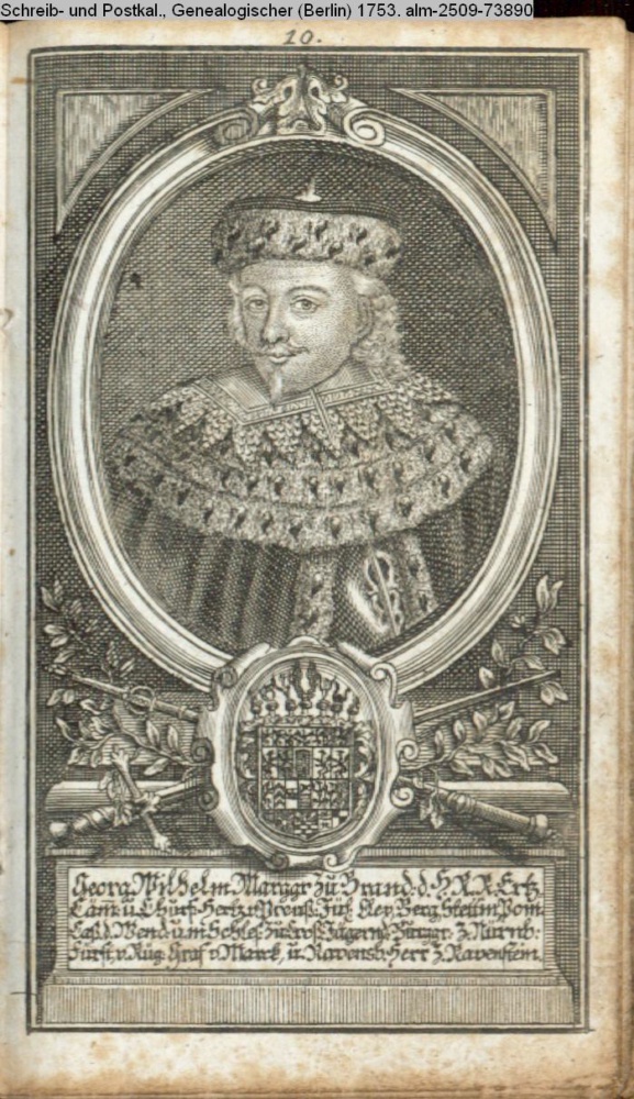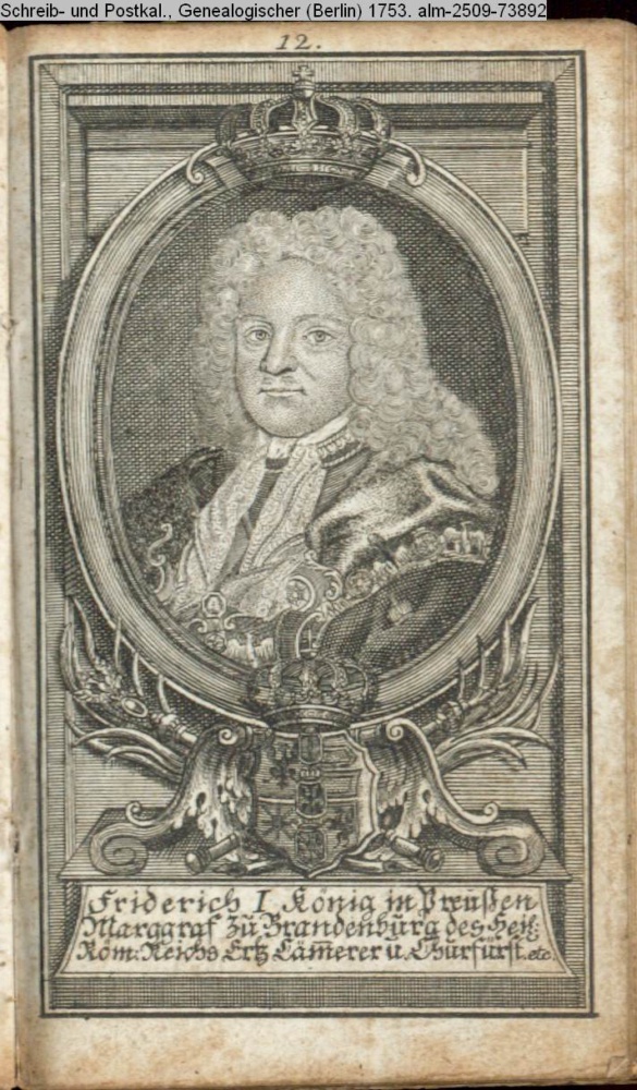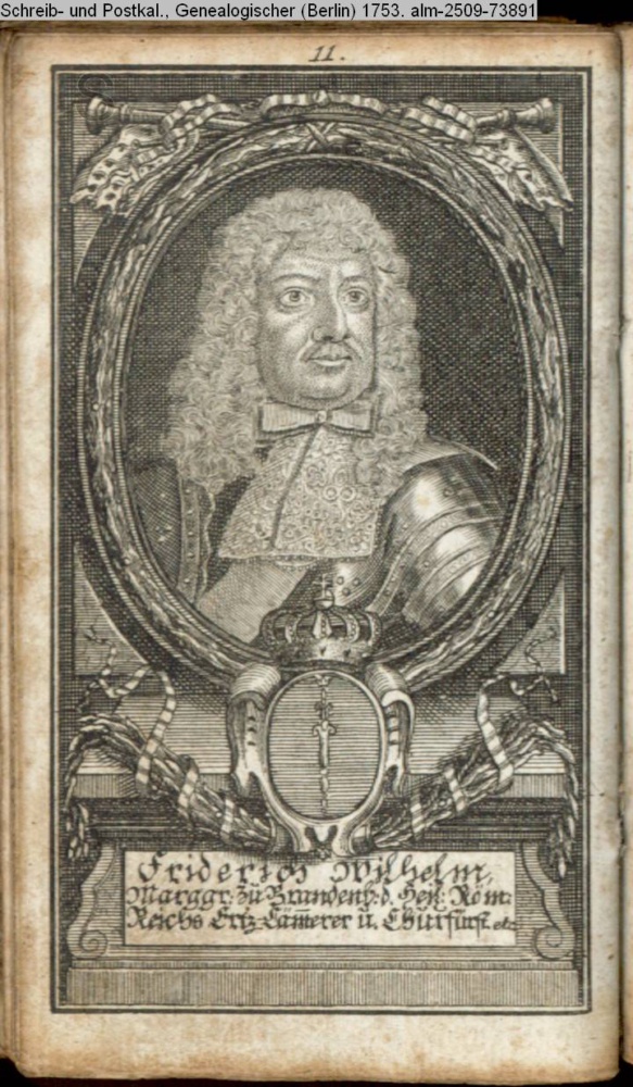 Die durchlauchtigsten Marggrafen Zu Brandenburg aus dem Hohenzollerischen Hause Von Friedrich I. bis auf Sr. jetztregierenden Maj. König Friderichs. In 14 Kupfern vorgestellet von J. G. Wolfgang Königl. Hof-Kupferstecher in Berlin (Sammlung INr 73880, Obj 27) s. Textbezug INr 73906, Obj 53