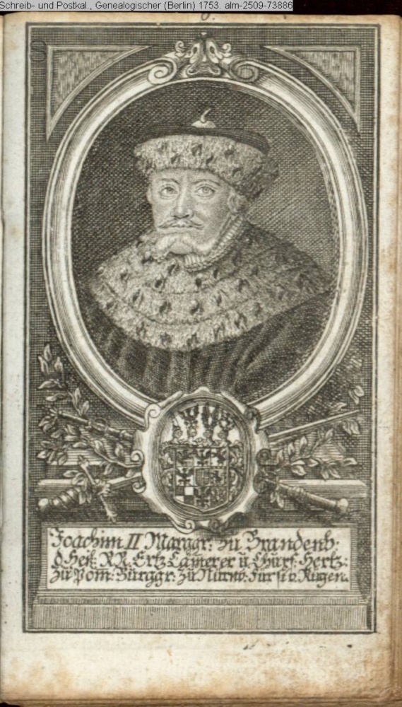 Die durchlauchtigsten Marggrafen Zu Brandenburg aus dem Hohenzollerischen Hause Von Friedrich I. bis auf Sr. jetztregierenden Maj. König Friderichs. In 14 Kupfern vorgestellet von J. G. Wolfgang Königl. Hof-Kupferstecher in Berlin (Sammlung INr 73880, Obj 27) s. Textbezug INr 73903, Obj 50