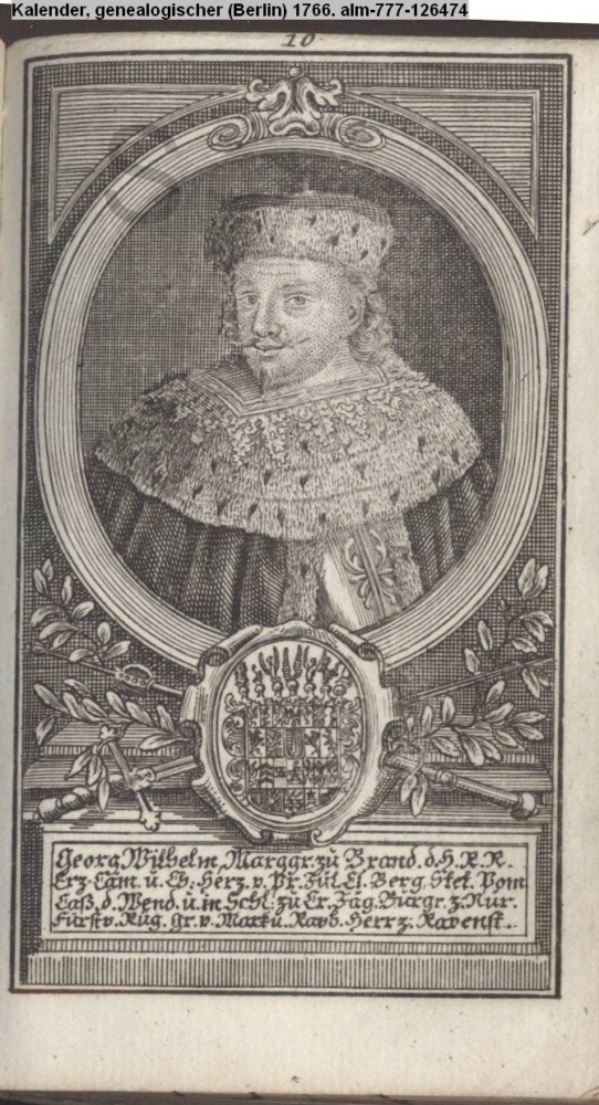 Die durchlauchtigsten Marggrafen Zu Brandenburg aus dem Hohenzollerischen Hause Von Friedrich I. bis auf Sr. jetztregierenden Maj. König Friderichs. In 14 Kupfern vorgestellet von J. G. Wolfgang Königl. Hof-Kupferstecher in Berlin (Sammlung INr 73880, Obj 27) s. Textbezug INr 73896, Obj 43