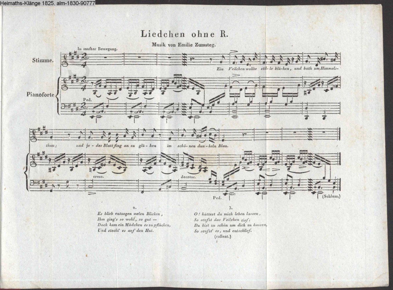 Ein Veilchen wollte stille blühen, und bath um Himmelsthau;…