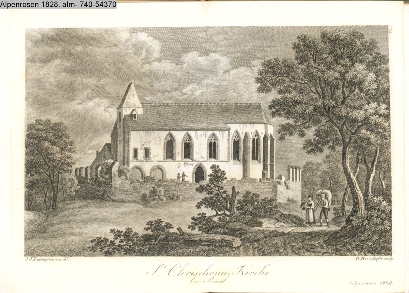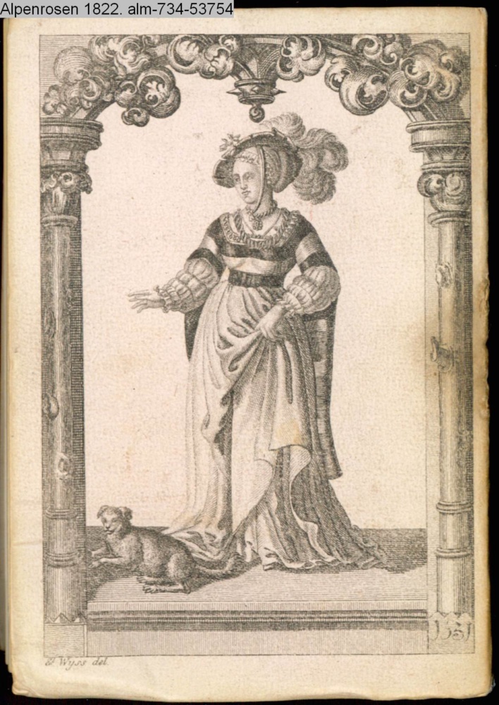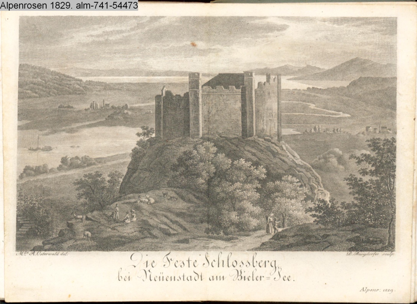 Anmerkung am bez. Text : Die hier beygefügte Ansicht, von der Hand einer geschätzten Künstlerinn gezeichnet, macht das Gegenstück zu der Ansicht im Jahrgange 1824, Seite 341 der Alprosen. Dort ist die Ferne südöstlich, hier südwestlich genommen [...] s. Graphik »Neuenstadt am Bieler-See im Canton Bern« in: Alpenrosen 1824; INr 53925
