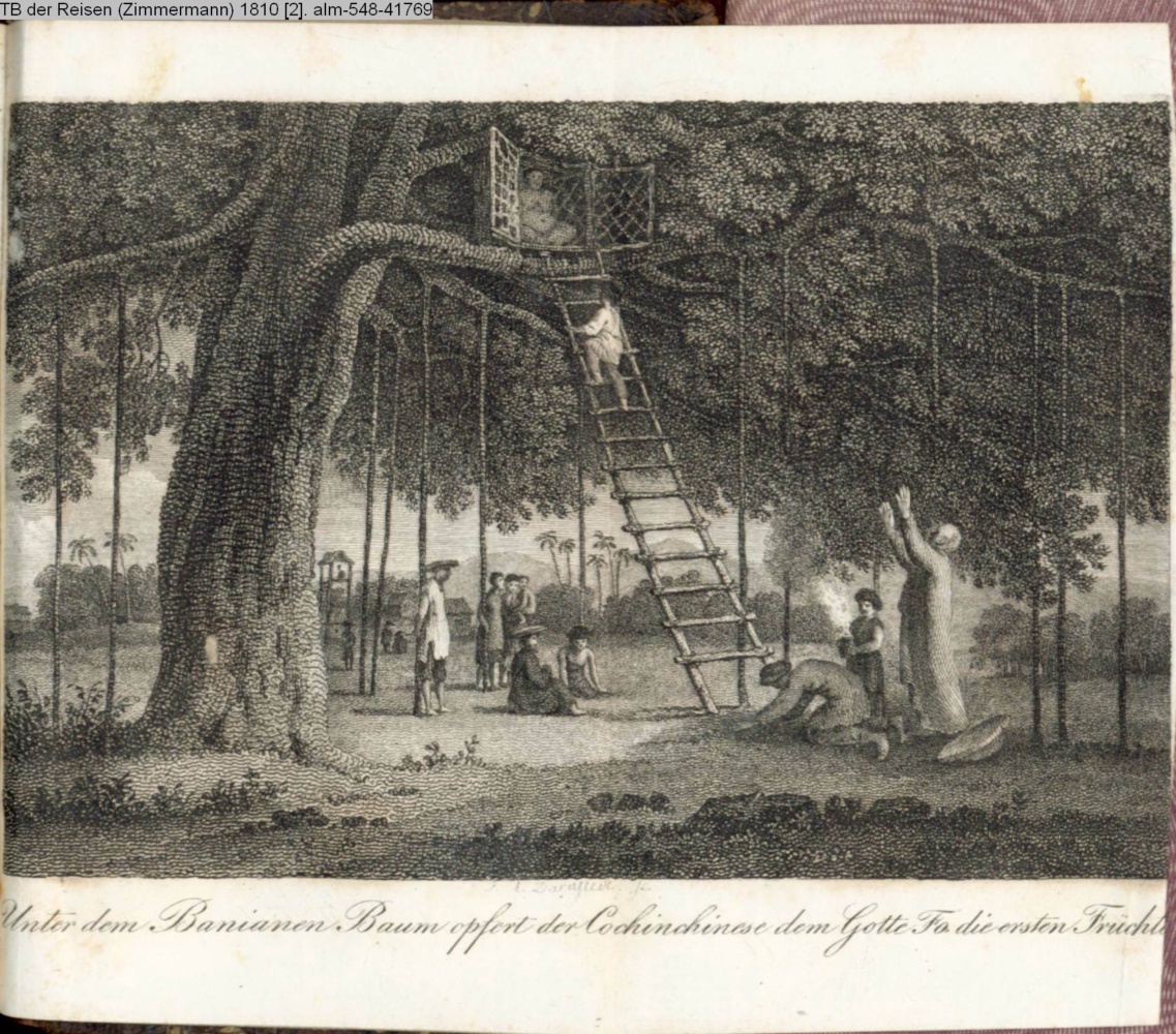 Unter dem Banianen Baum opfert der Cochinchinese dem Gotte Fa die ersten Früchte