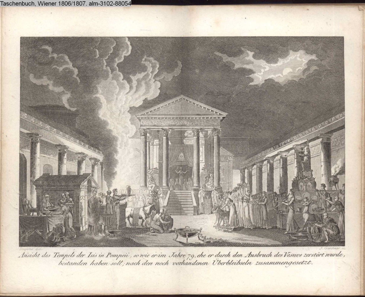 Ansicht des Tempels der Isis in Pompeji, so wie er im Jahre 79, ehe er durch den Ausbruch des Vesuvs zerstört wurde, / bestanden haben soll; nach den noch vorhandenen Überbleibseln zusammengesetzt