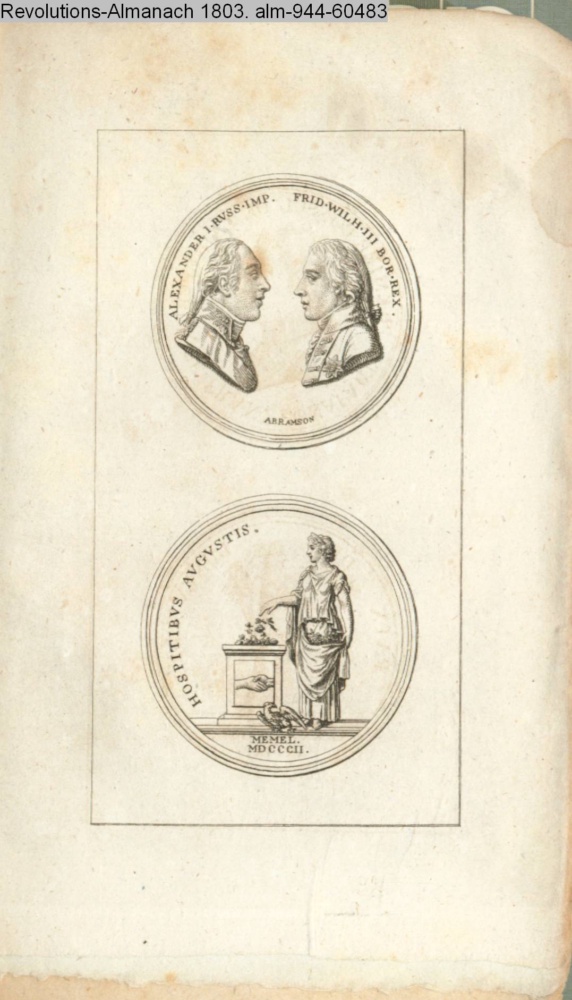 ALEXANDER I. RUSS. IMP. FRID.-WILH. III BOR. REX. // HOSPITIBUS AUGUSTIS. / MEMEL. / MDCCCII