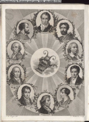 10 Portraitmedaillons um Leier mit Lorbeerkranz