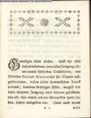 Gunstiger liber Leser. Hast dir wol laßen belybenn, den ersten Jargang echter und lyblycher Volckslyder, aus Meister Gabryel Wunderlichs sel. Munde uffgeschrybenn, deßen solstu frewndlichen Danck habenn,…