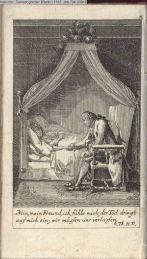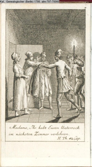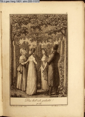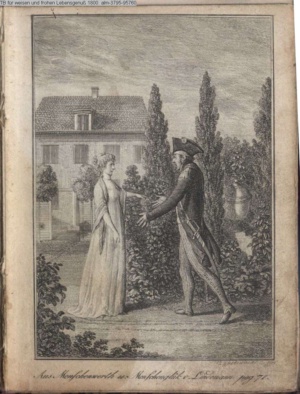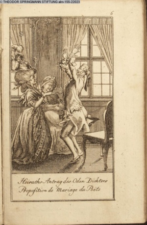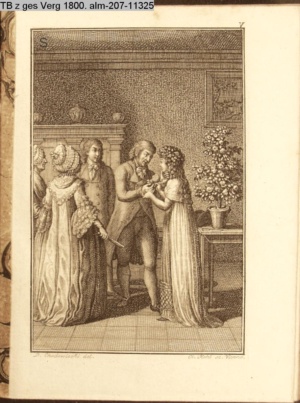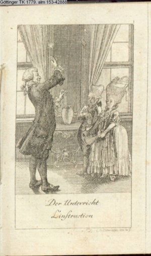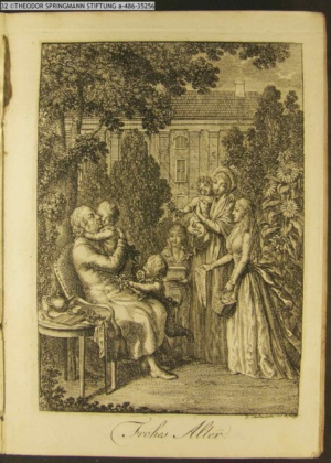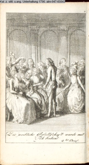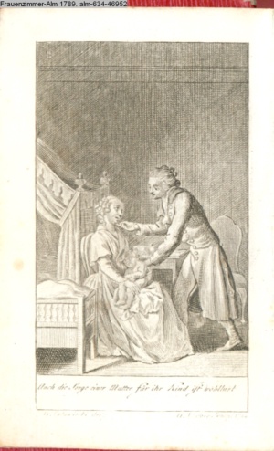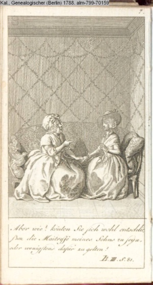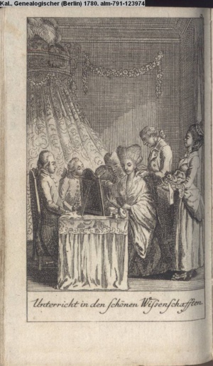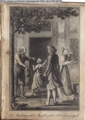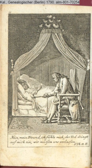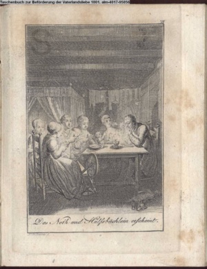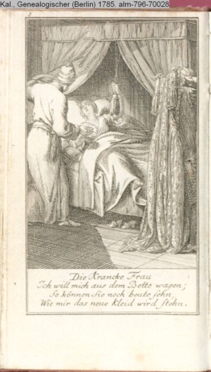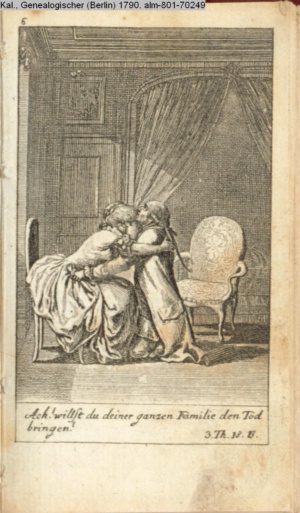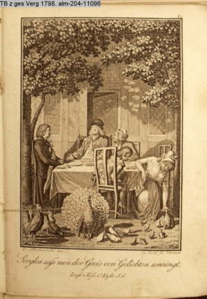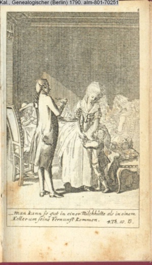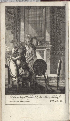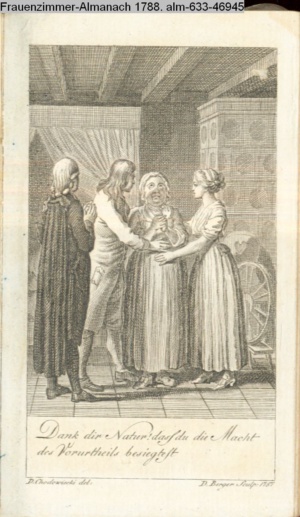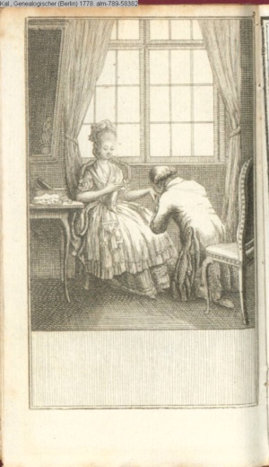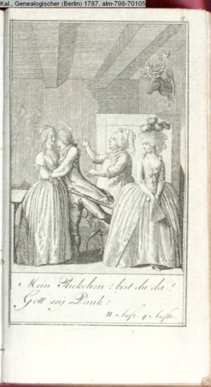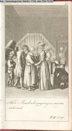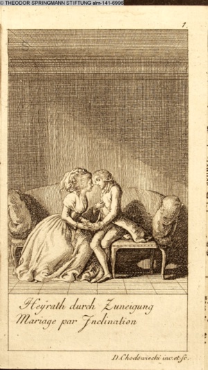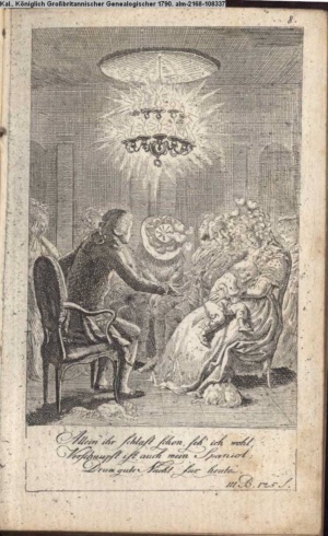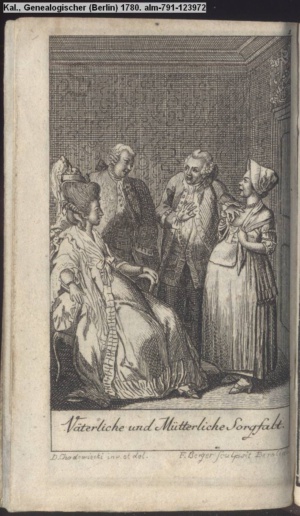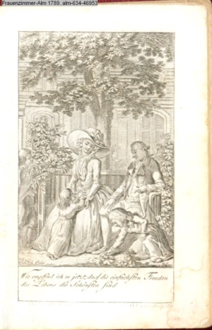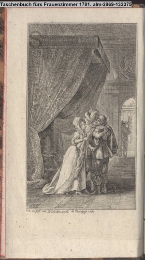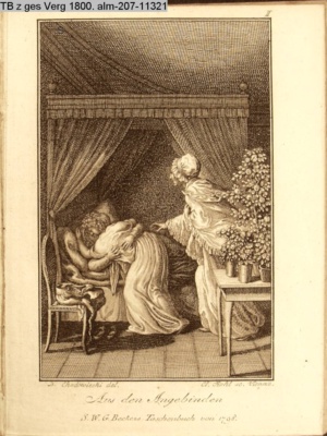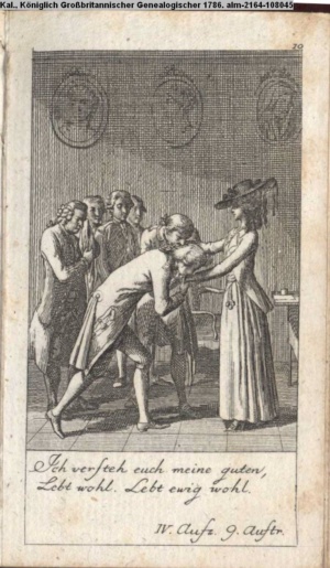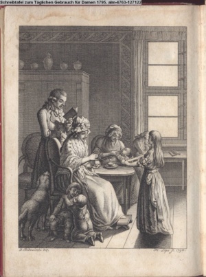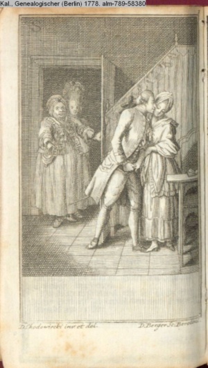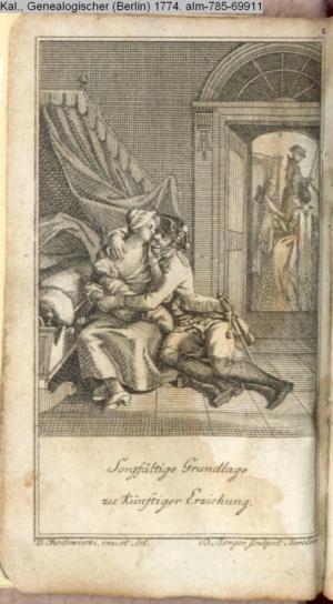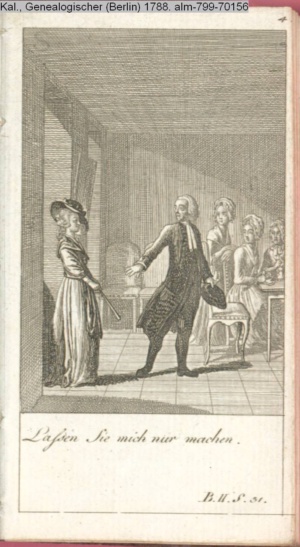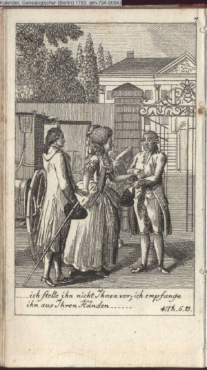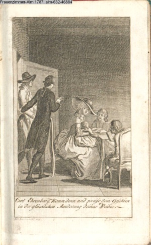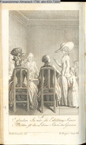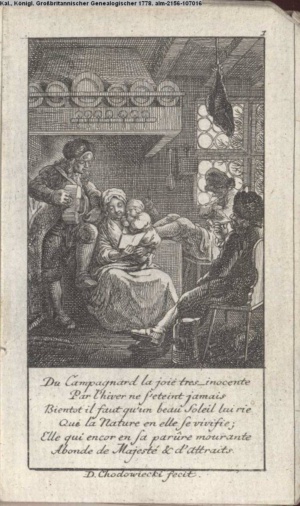 4. Blatt der uite »4 Blätter zu der Familie Hellmuth von Hiemer« von D. Chodowiecki 1798. s. BAUER, Jens-Heiner: Daniel Nikolaus Chodowiecki. Das druckgraphische Werk. Die Sammlung Wilhelm Burggraf zu Dohna-Schlobitten. Ein Bildband mit 2340 Abbildungen in Ergänzung zum Werkverzeichnis von Wilhelm Engelmann. Hannover 1982. No. 1934-1937
